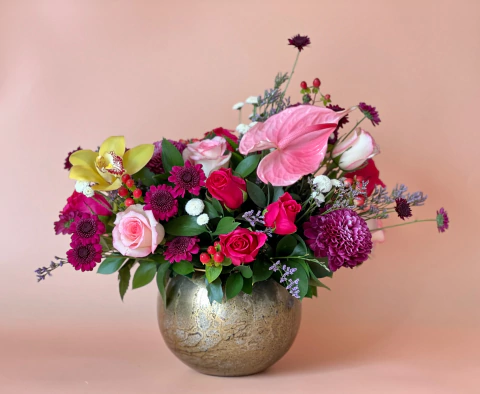 Bowl de vidrio con rosas, orquideas y Anturios en tonos rosados y fuscia, más pequeñas flores de complemento. Algunas flores pueden variar según la disponibilidad
